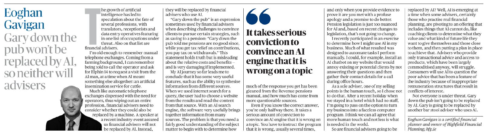 I recently participated in an exercise to determine how I might use AI in my business. Much of what resulted was designed to automate tasks I currently perform manually. I could for example, install an AI chatbot on my website which would annoy existing or potential clients by not answering their questions and then gather their contact details for a call during office hours. As a sole adviser one of my selling points is the human touch, so I chose not to do that. After a recent holiday experience where we stayed in a hotel which had no staff I’m going to pass on the option to turn my business into a faceless computer programme. I think we can all agree that more human touch and not less is what is needed in the world.